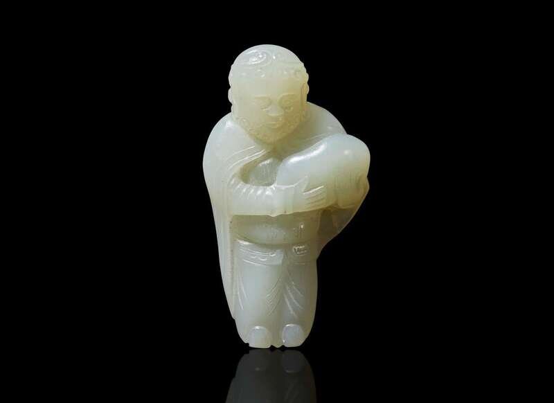 A small Chinese carved pale celadon jade figure of a foreigner 青白玉雕胡人
