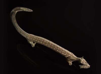 The elongated weasel-like stylized creature with scroll eyes and scroll pattern bands down its back, grasping a fish in its mouth, the long tail arched over its back, each pair of scrolled feet grasping a slender bar, beige and dark brown patina