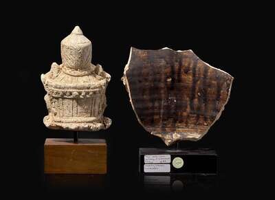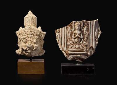 A Thai stucco head of a guardian and a large Thai vessel fragment, 14th-15th century 暹羅石灰岩雕及陶片 十四至十五世紀