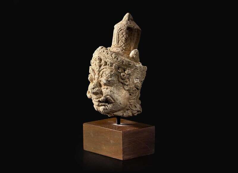 The fierce face of the guardian with elaborate headdress, mounted on a later wood stand; the stoneware fragment, Si Satchanalai, modeled with a celestial figure (Thepphanom), partially accentuated with iron-brown glaze, later stand.