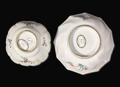 The larger of swirled faceted form, decorated with chrysanthemum, flowering prunus, and bamboo sprays, the center with a ho-o roundel; the smaller of squared floriform, decorated with peony and floral sprays.