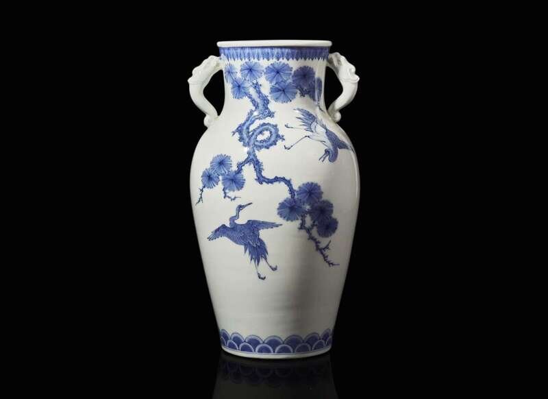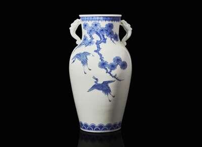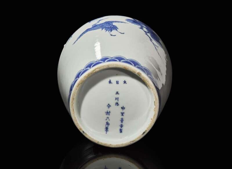 A Japanese Hirado blue and white porcelain "Crane and Pines" vase, decorated by Imamura Rokuro, Meiji period 日本平戶“松鶴”青花瓷瓶 今村六帛筆 明治