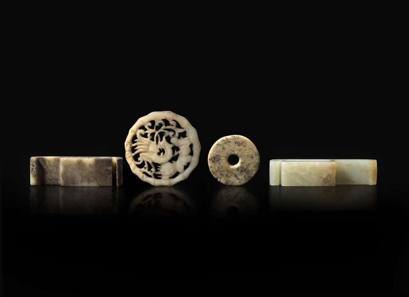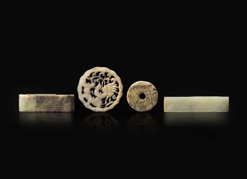 The group consists of two jade sword scabbard slides, a reticulated phoenix pendant, and a small bi disc.