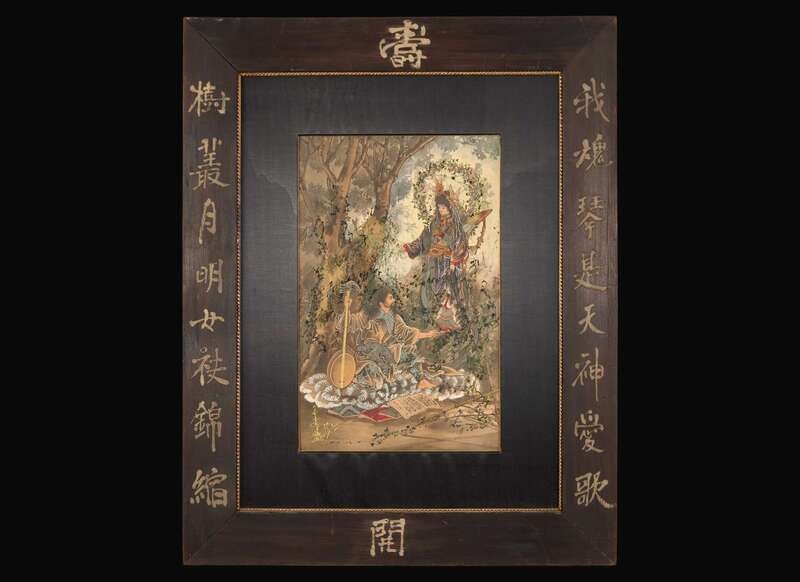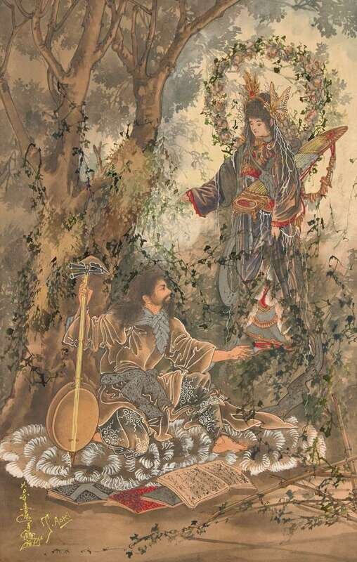 Ink and color on paper, laid on to card, signed in Japanese and English lower left; framed, matted, and glazed, the original frame inscribed in Japanese, which may be loosely translated as “…My soul, heavenly deity's love song... Moonlit grove, a Goddess in brocade…”