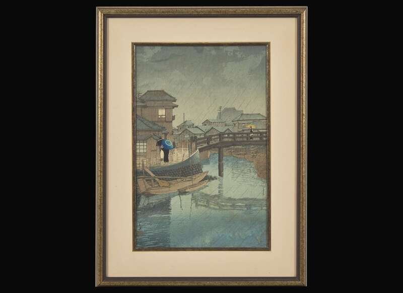 Woodblock printed in colors, framed. matted and glazed