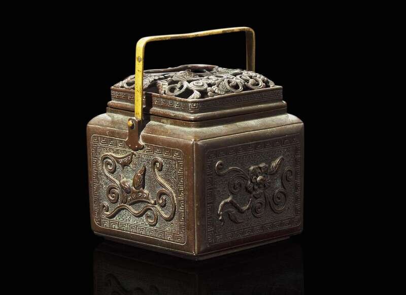 The square vessel cast with floral scrolls within modified fret borders, the openwork cover with stylized floral scrolls, dark brown patina, the square handle with polished surface