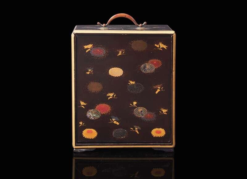 The rectangular cabinet with side panel sliding up to reveal drawers, decorated with chrysanthemum blossoms and various florets, with a copper alloy bail handle to top, all resting on low bracket feet.