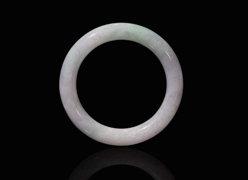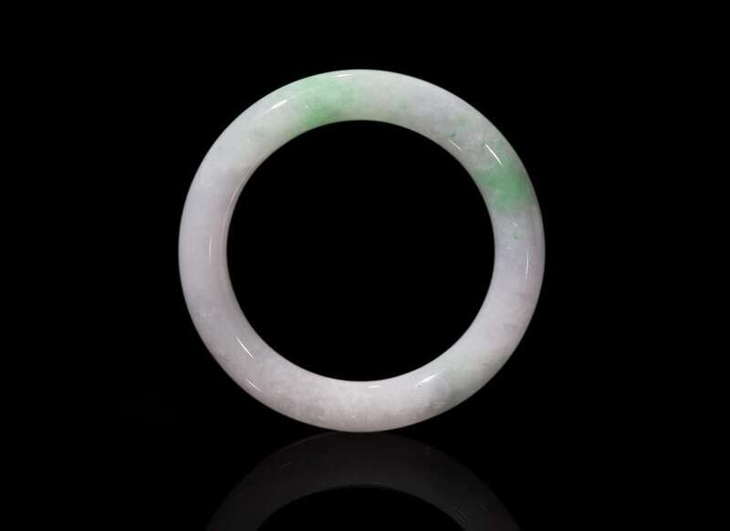 The circular bangle of round section, of a white tone with pale apple-green inclusions, accompanied by a certificate from Hong Kong Jade and Stone Laboratory Limited, dated December 4, 2019, stating the stone is natural - type A, with no resin detected.