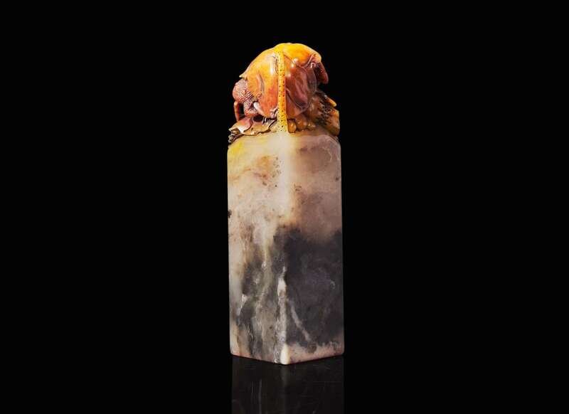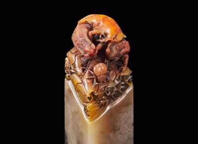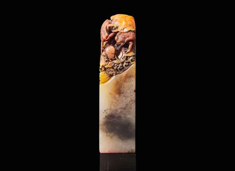 The tall vertical seal of square section, the mottled grey and russet stone carved at the top with two toads under a lotus leaf, pursuing a beetle, the side inscribed “Wei Shuo Xun You Zu Yi Qing”(未說尋徑足已輕) dated to a wushen year, equivalent to 1908, “Daxin”, the seal face with same inscription "Wei Shuo Xun You Zu Yi Qing" in seal characters.