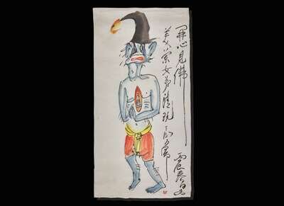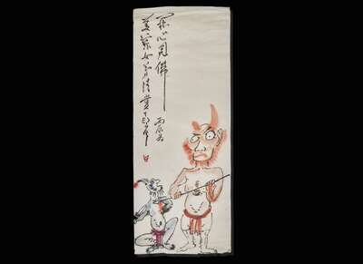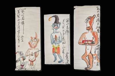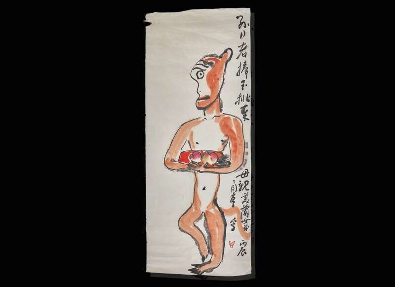 Ink and color on paper; Zhongkui and Demon signed, inscribed, dedicated to Meilan Nvdi, and dated to a bingchen year, equivalent to 1976, and with one seal, upper left, unmounted; ; Monkey with Peaches signed, inscribed, dedicated to Meilan Nvdi, and dated to a bingchen year, equivalent to 1976, and with one seal, along right side, unmounted; Demon (with Buddha Heart) signed, inscribed, dedicated to Meilan Nvdi, and dated to a bingchen year, equivalent to 1976, and with one seal, along right side, unmounted; H: 34 ¾ in.; W: 13 ¾ in.; H: 34 ¾ in.; W: 13 ¾ in.; H: 26 ½ in.; W: 13 ¾ in.