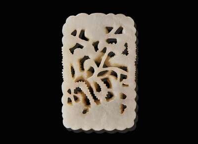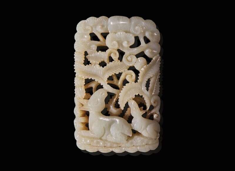 A Chinese carved white jade "Deer" fudiao plaque, possibly Ming dynasty 白玉浮雕牌飾 可能為明