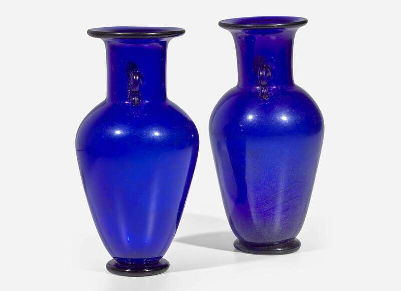 Both vases with flared lip, tall neck, ovoid body resting on a splayed foot, twin scroll handles at the shoulder, unusual double-bar pontil mark to the underside; the rich blue glass with areas of crizzling to the surface