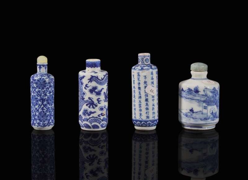 Comprising a snuff bottle with dragon, one with landscapes (both with “dragon” marks to underside; one with a lengthy inscription, underside with four-character “Guan yao jing zhi” mark; and one with lotus scrolls.