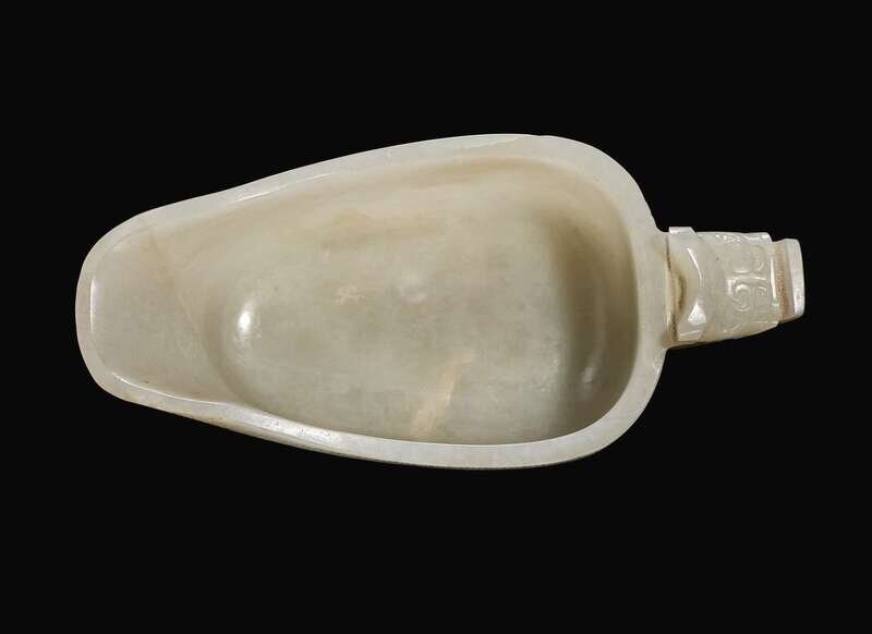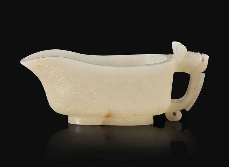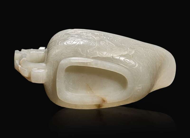 The unusual large water coupe inspired by a bronze “Yi”, with a stylized taotie head to one side as handle, the exterior carved in low relief with dragon and clouds, other side with Phoenix, rim embellished with fret motifs, very softly polished