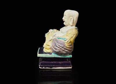 A Chinese glazed biscuit figure of Budai, Kangxi period 素三彩佈袋和尚 清康熙