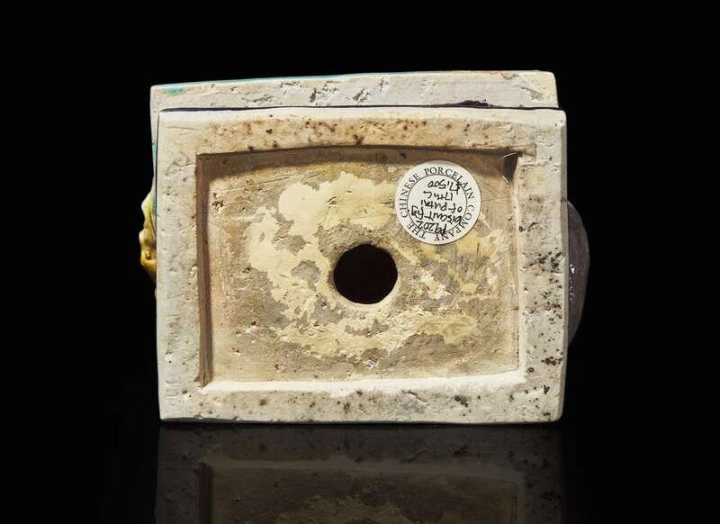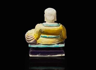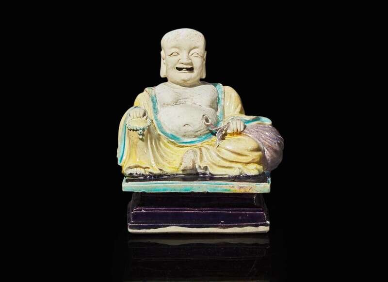 The seated deity with open mouth and broad smile, a rosary in one hand, a large sack to one side; his robe glazed yellow and turquoise, the rectangular stepped base and bag with aubergine