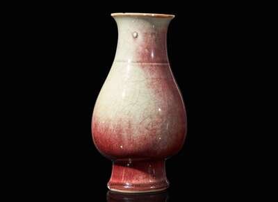 Potted in the form of "Zhi" vase, the crackled glaze with red and pale green tone.