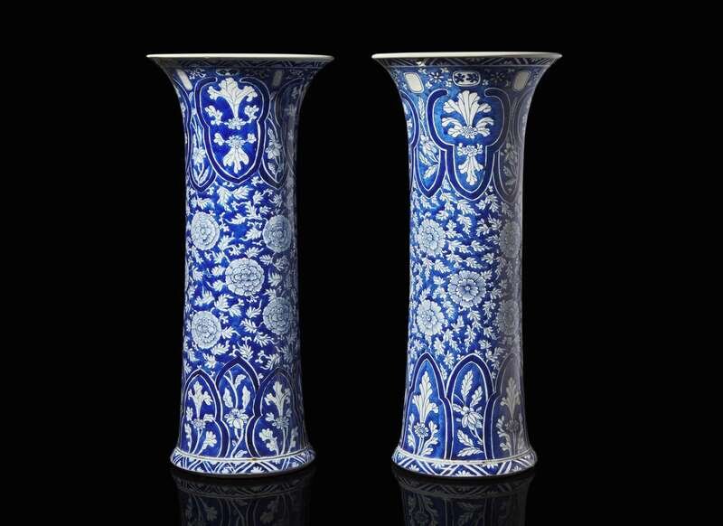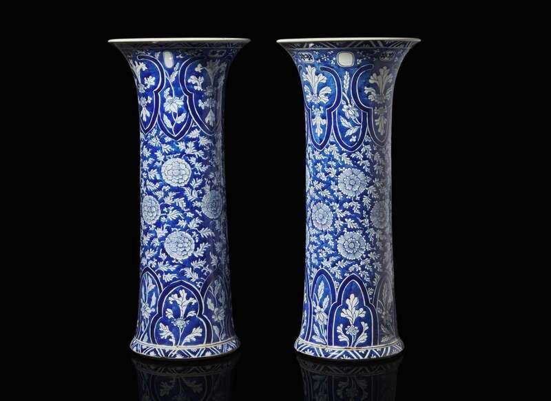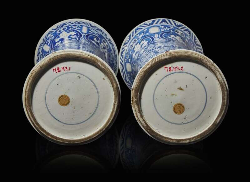An associated pair of Chinese export blue and white porcelain large beaker vases, Kangxi period 外銷瓷青花花觚或一對 清康熙