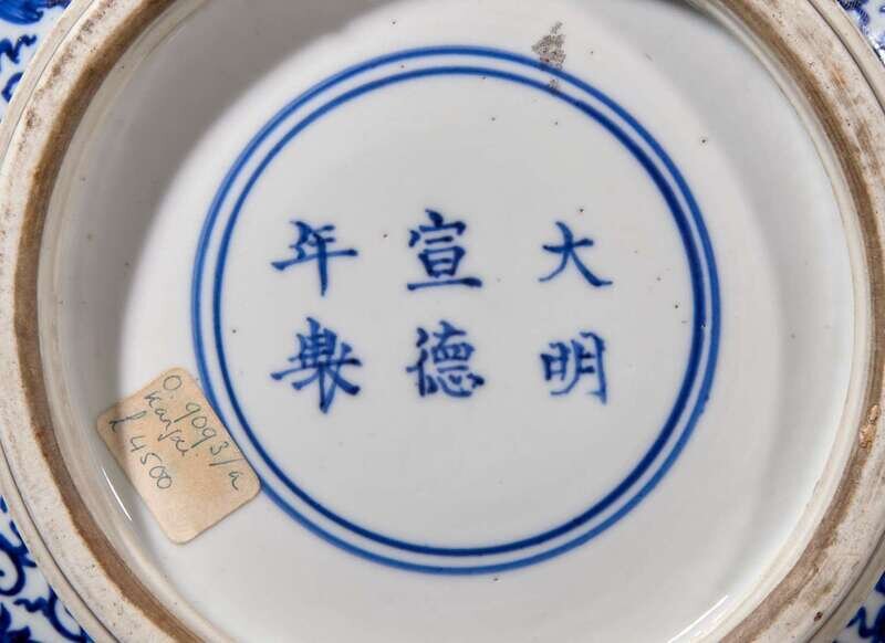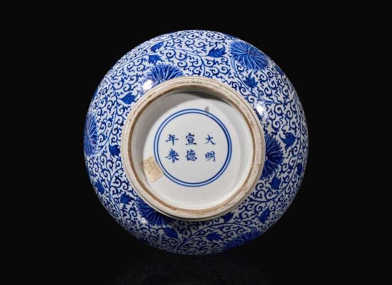 With compressed bulbous body, tapered vertical neck, decorated with interlocked lotus scrolls below vertical lappets, lotus scroll border at the mouth; Xuande six-character mark to the underside.