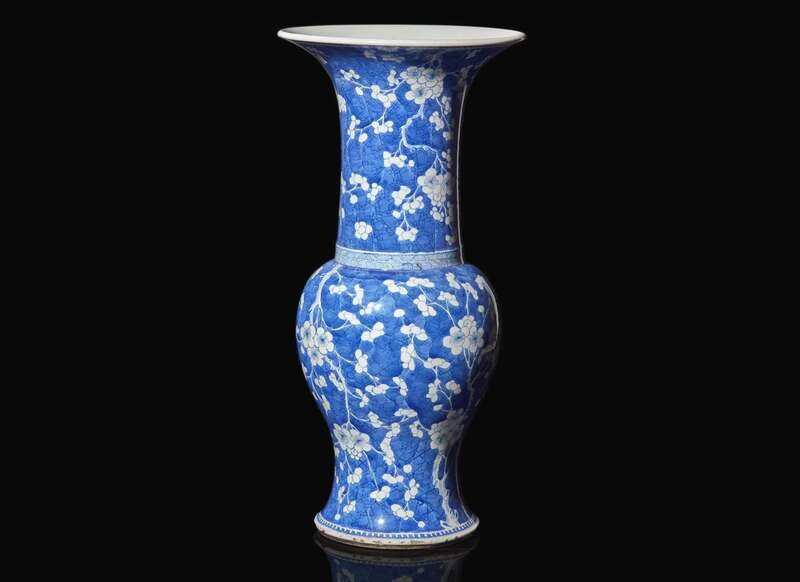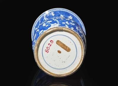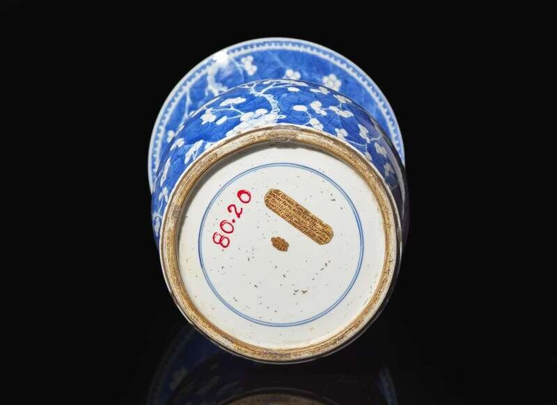 The vase decorated with prunus against a cracked-ice pattern, all separated by a diaper band at the waist, underglaze blue double circle to the underside.