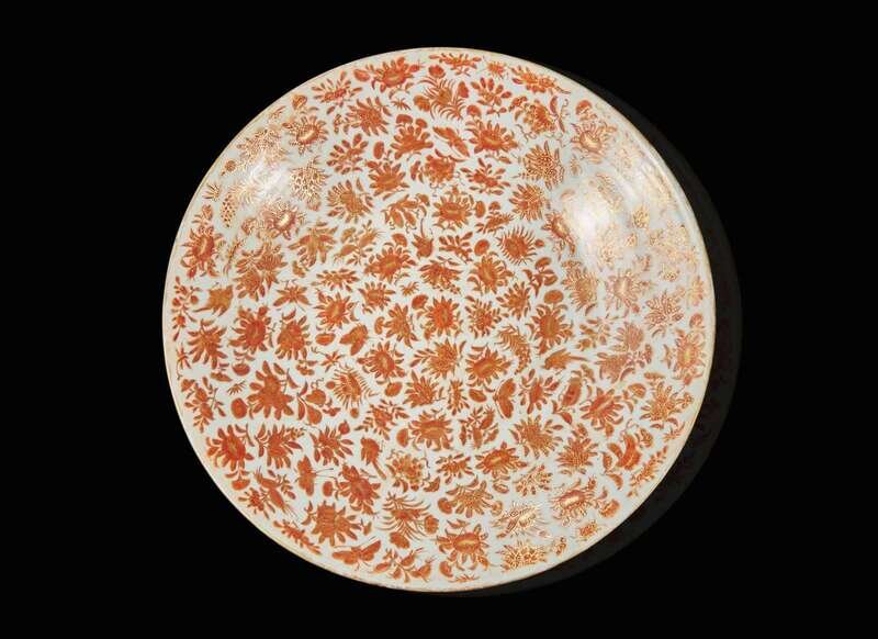 The circular dish decorated with iron-red fruits, flower sprays, birds, and insects, outlined by gilding