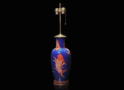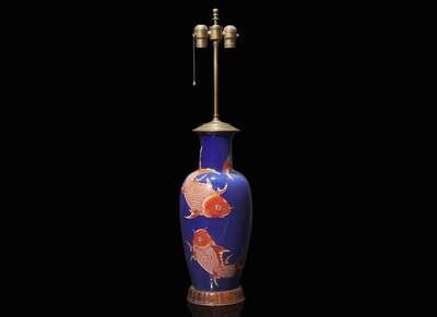 A Chinese blue ground "Carp" vase, now mounted as a lamp 藍地錦鯉瓶嵌檯燈