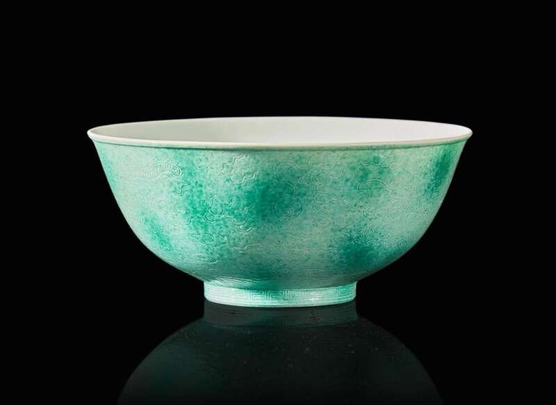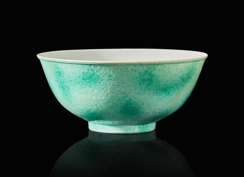 The circular bowl with ridged lip, the exterior engraved with two sinuous five-clawed dragons among clouds chasing flaming jewels, above crashing waves and rockwork, band of key fret to side of the foot; with a mottled green enamel ground; underside with six-character mark in underglaze blue