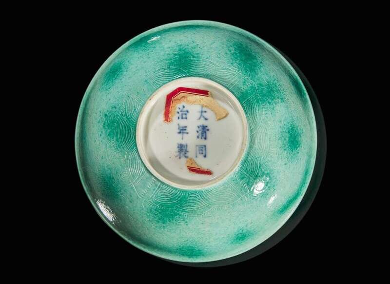 A Chinese incised porcelain faux-jadeite "Dragons" bowl, Tongzhi mark and of the period 龍紋瓷盌 同治款 清同治