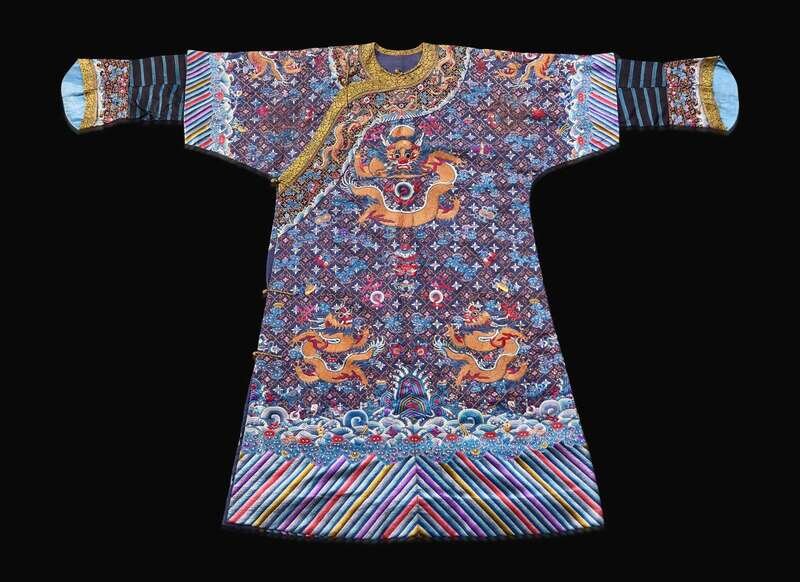 The robe decorated with nine dragons against a diaper ground, above mountains, crashing waves, and a lishui hem