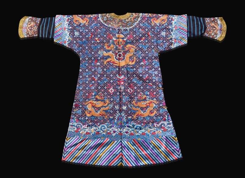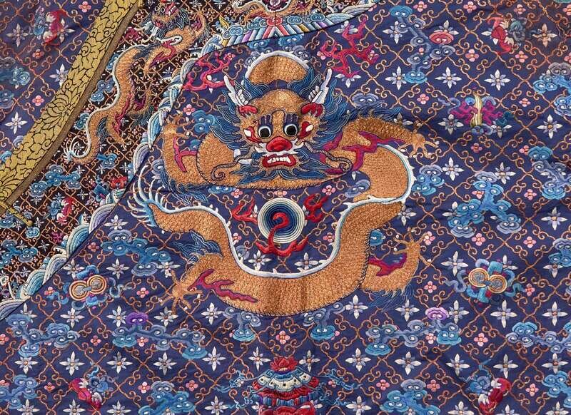 A Chinese embroidered blue silk "Nine-Dragon robe, Qing dynasty, circa 1900 海水江崖九龍紋袍 清 約1900年