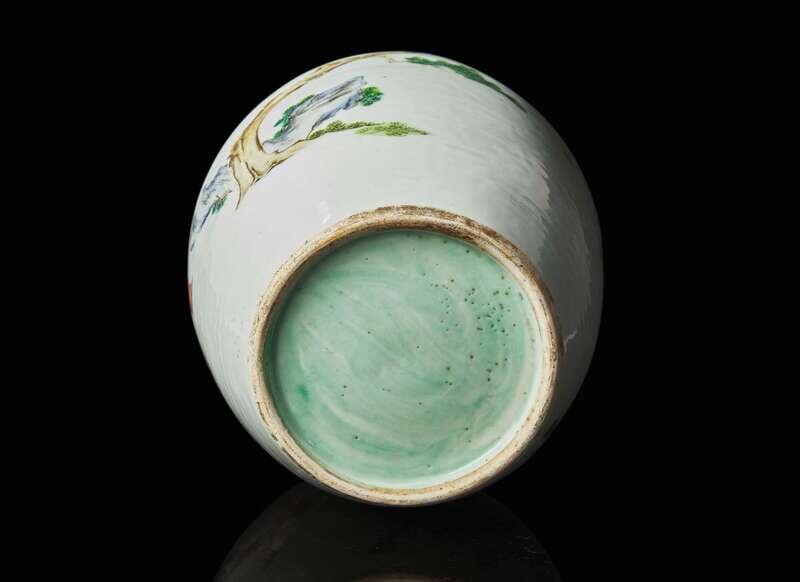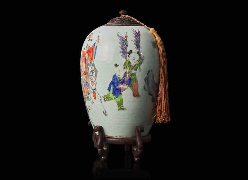 Decorated with a scene of a high official with attendant, among playful boys holding banners and umbrella, celebrating his great success taking the examination, the underside with pale turquoise-green glaze, with carved wood cover and stand.