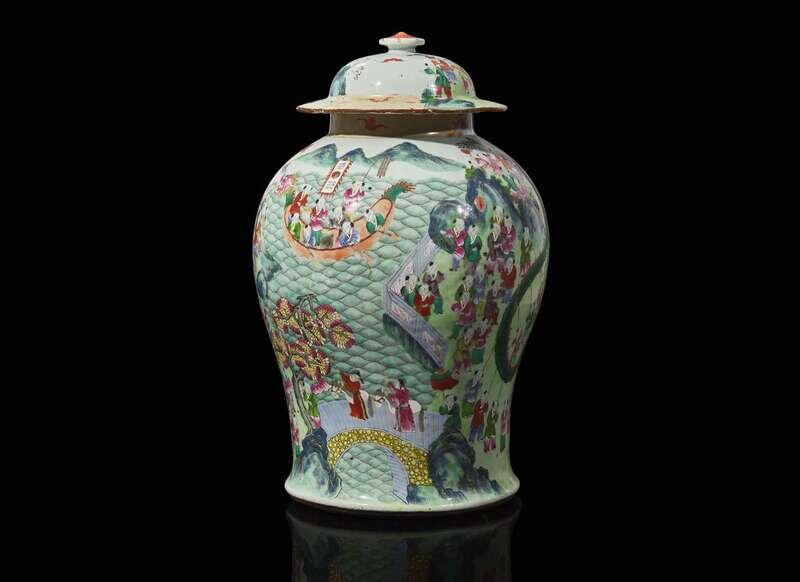 Fully decorated with boys and attendants in an extensive river and garden landscape, the groups of playful boys are pursuing various activities including dragon dance, dragon boat, playing instruments, and games, red bats painted around neck and cover, similar boys-decorated cover topped by an iron-red chrysanthemum-painted knop