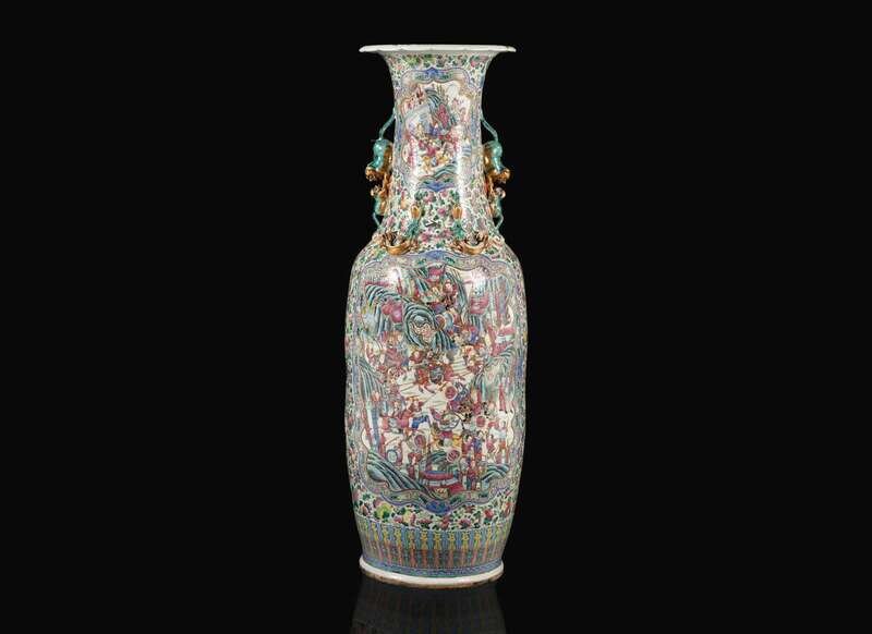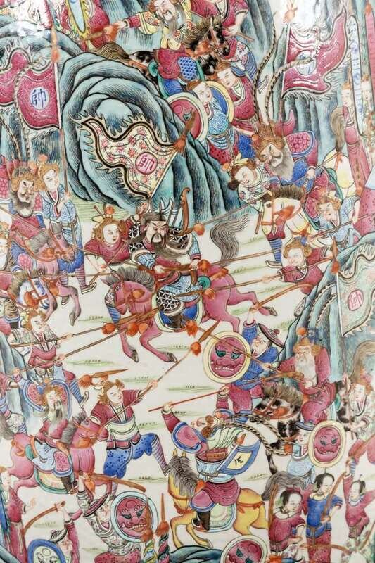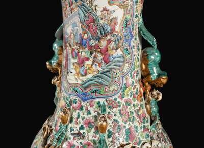 Of tapering vasiform with scalloped everted lip, the neck flanked by a pair of large and small Buddhist lions (Dashi Xiaoshi), and two pairs of sinuous dragons on the shoulder; the body elaborately-decorated on one side with a battle scene, the other side with various generals and courtiers in a pavilion setting; two additional smaller figural reserves to the neck, and shaped reserves to the body, all against a ground of birds, flowers and auspicious fruits