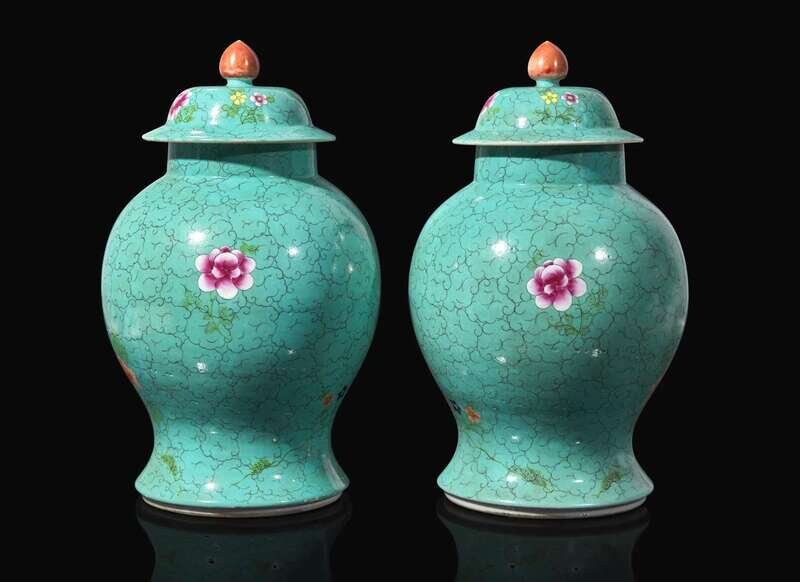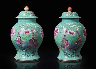 A pair of Chinese turquoise ground jars and covers 松石綠地蓋罐一對