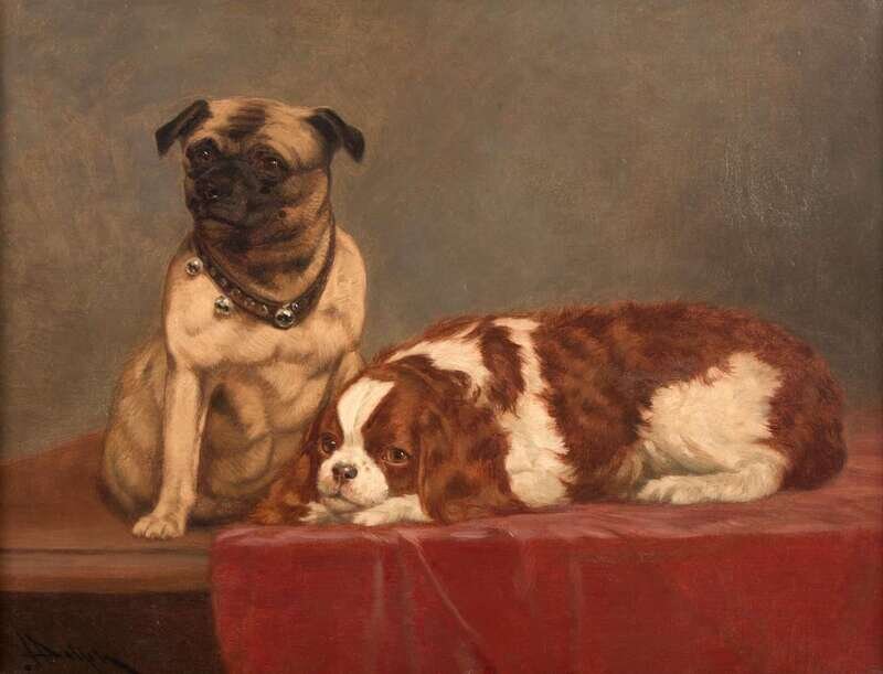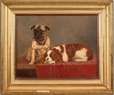 John Henry Dolph (American, 1835-1903) - Pug and Blenheim Spaniel on Table with Red Drapery