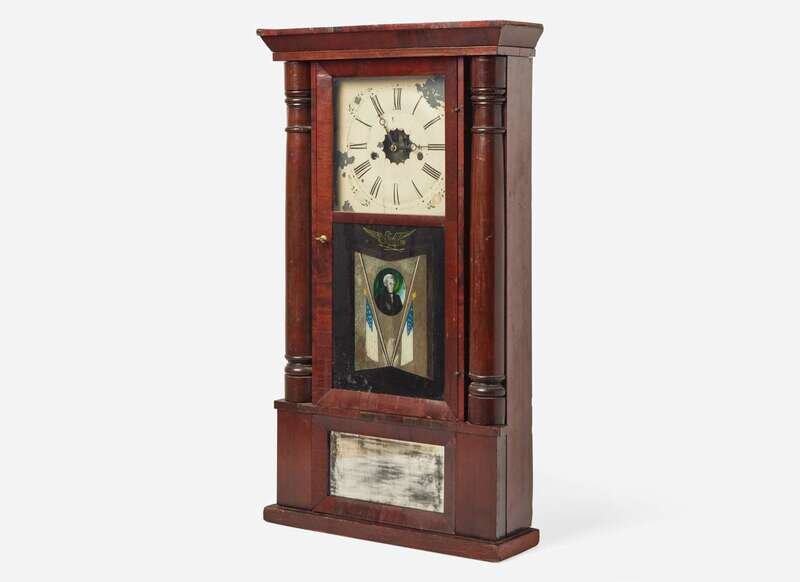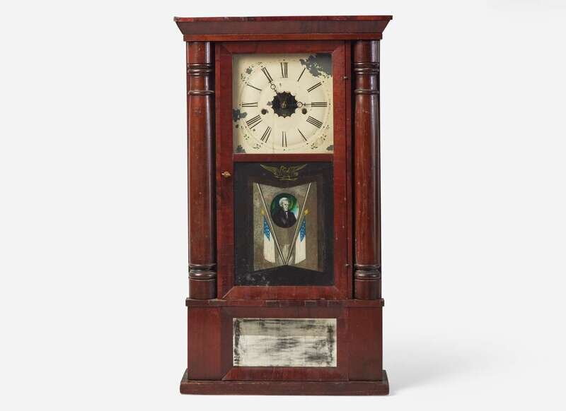 A Classical mahogany mantel clock with Andrew Jackson eglomise panel, bears printed paper label of J.C. Brown, Forrestville, CT, circa 1835