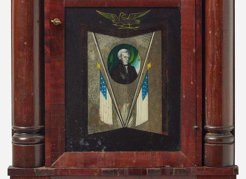 The reverse-painted panel depicts Andrew Jackson (1767-1845) flanked by American flags.