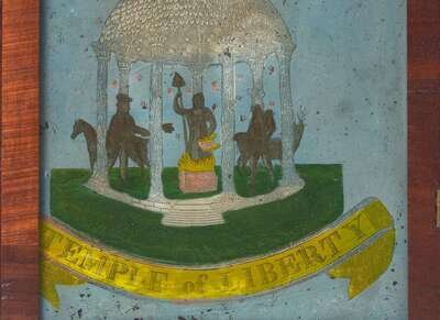 The ogee-molded frame, door with reverse painted panel “Temple of Liberty."