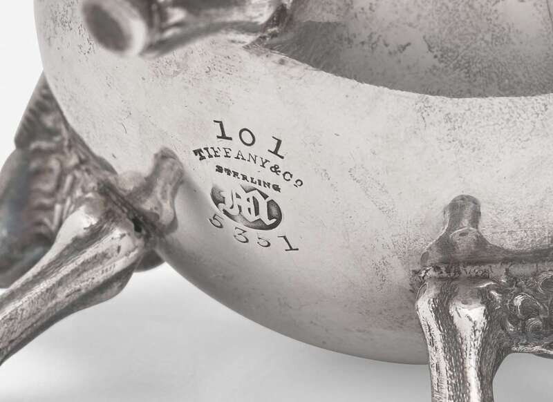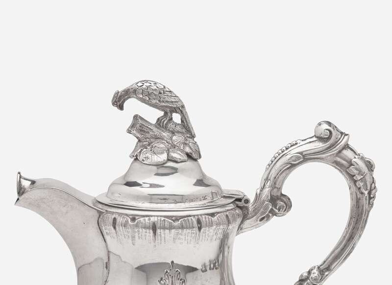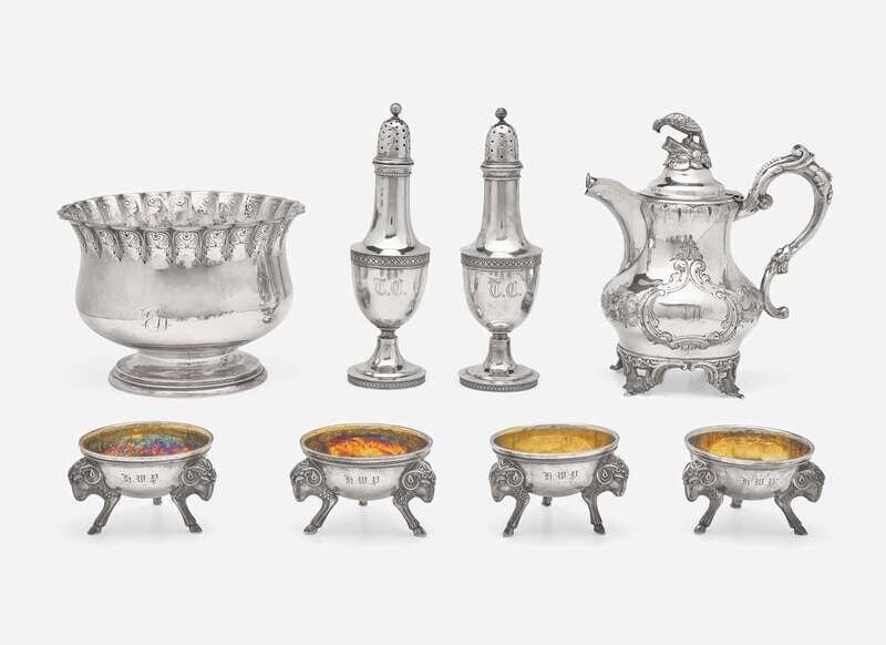 Comprising a hot water jug with pheasant-form finial, circa 1850s, engraved with monogram, “EW," marked; a footed bowl by Grosjean and Woodward, circa 1853-1865, with flared and scalloped rim, also engraved with monogram, “EW," marked; a pair of salt and pepper shakers, engraved with monogram, “T.C.,” marked; and a set of four salt cellars with ram and hoof-form feet, gilt-washed wells, engraved with monogram, “H.W.P,” marked.