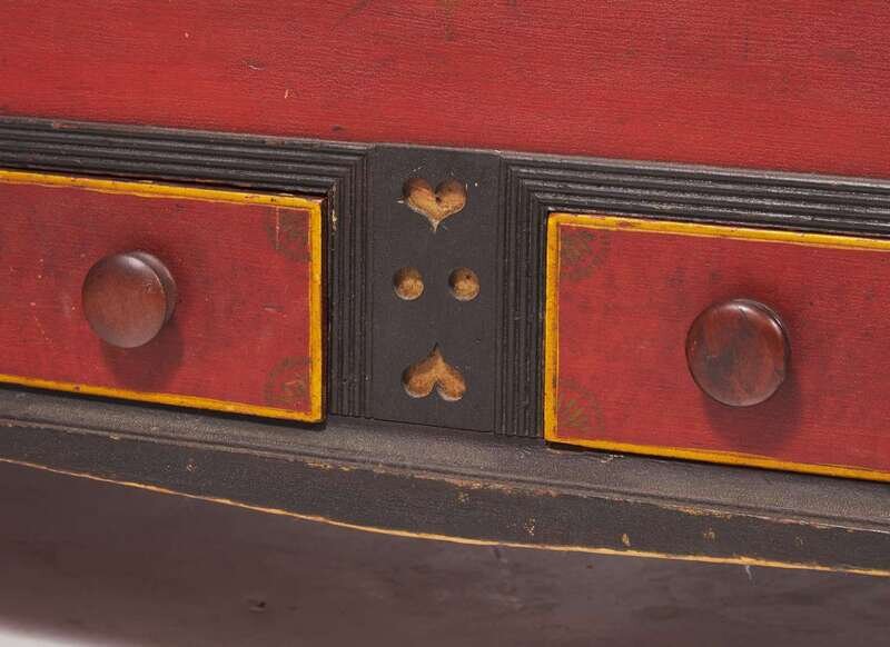 The case stenciled with the initials, “C.T. W.," and decorated with Neoclassical devices, the drawers stenciled with leafy sprays and flank panel with heart cut-outs, fitted with a till.