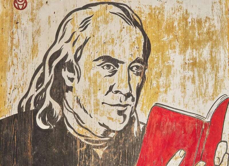 Double-sided, mounted with wrought iron hardware, inscribed, “Founded in 1728 by Benjamin Franklin/ Franklin Printing Company," and signed with artist's cipher, u.l.