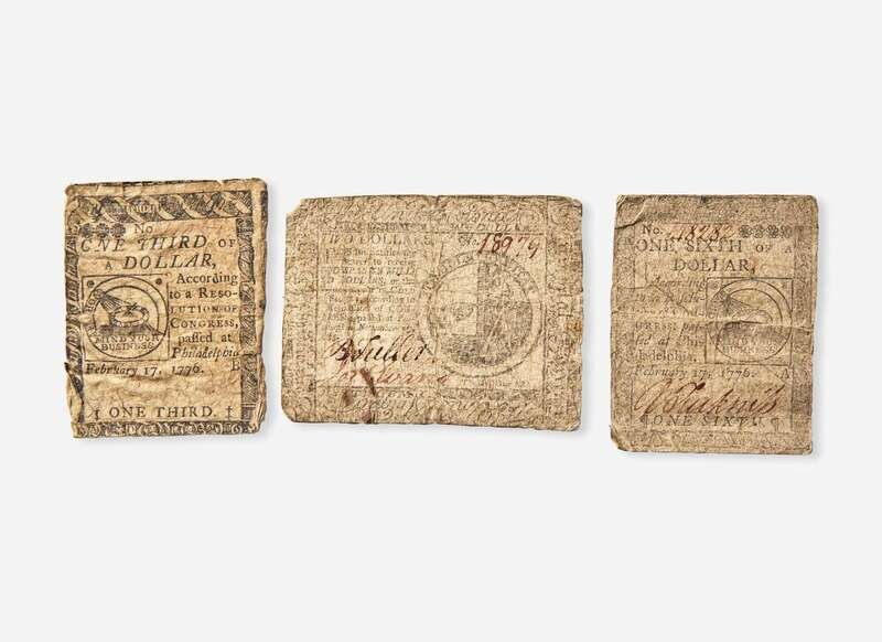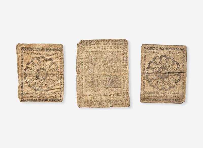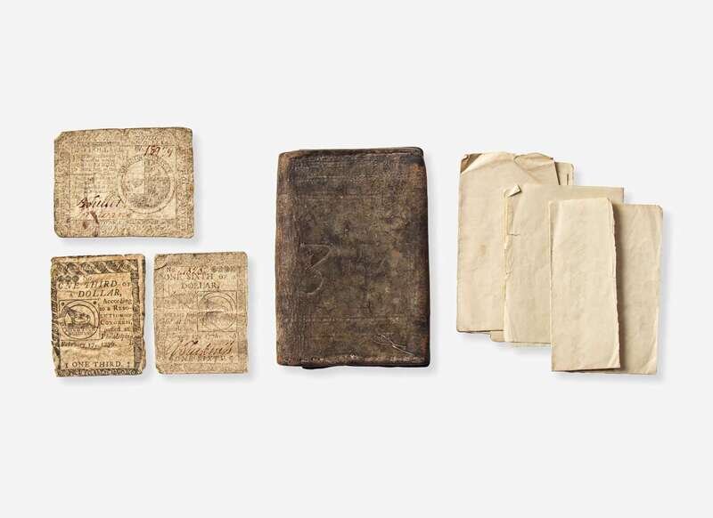 The folding pocketbook is dated on the exterior, “1737,” and initialed on the inside, “R M,” together with three Hall & Sellers, Philadelphia printed paper Continental Currency notes, all dated 1776.