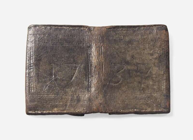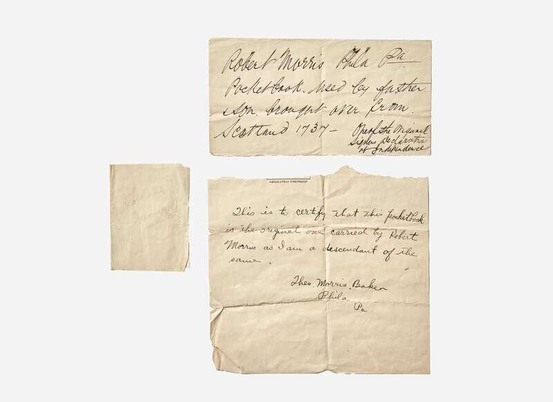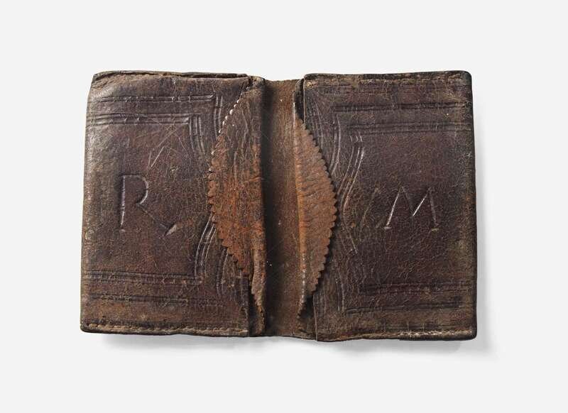 A tooled, dated and initialed leather pocketbook, belonging to Robert Morris, Sr. (1711-1750) and Robert Morris, Jr. (1734-1806), dated "1737"