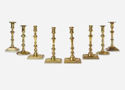 A group of eight Chippendale brass candlesticks, England, late 18th century