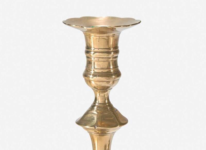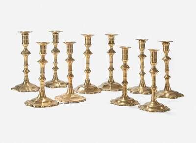 A group of ten George II scallop or petal-base brass candlesticks, England, 18th century
