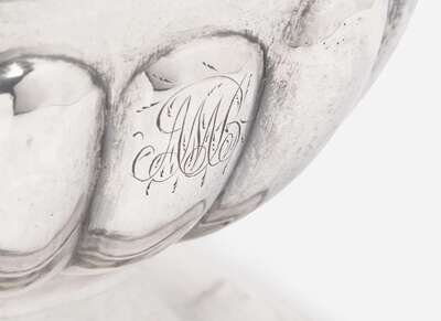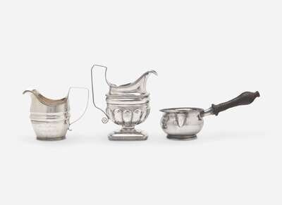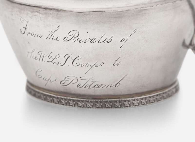 Comprising a porringer by Thomas Whartenby, with flared rim and foot, turned wood handle, engraved with monogram, “MM,” marked; a creamer by William Haverstick, Sr. or Jr., of Classical form, with lobed body, on footed base, with scrolled handle, engraved three times to body with monogram, “AMB,” marked; and a silver creamer, of Classical form, with scrolled handle, engraved to body, “From the Privates of the W.L.J. Comp to Capt. P. Titcomb,” apparently unmarked.