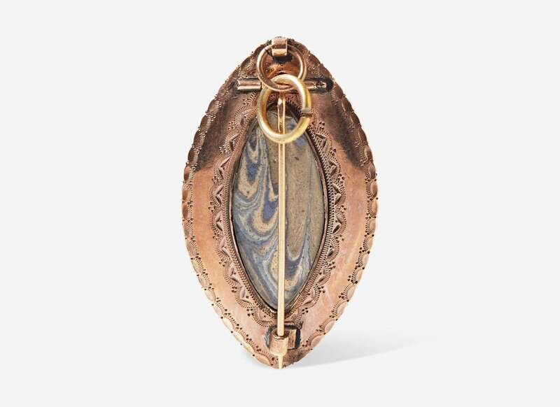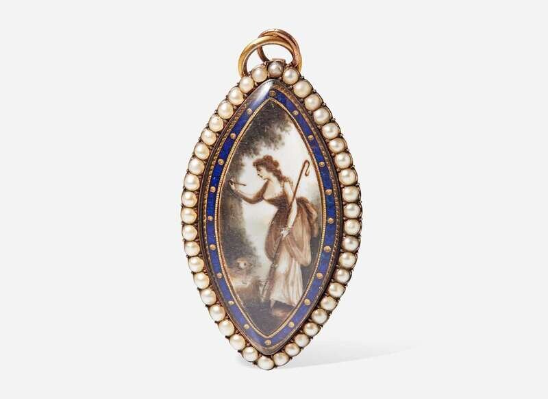 Of navette form, showing shepherdess carving initials in a tree in polychrome, the bright-cut reverse with aperture, enamel and seed-pearl embellished case.