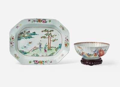 The stand in Famille Rose decorated with figure in a landscape, the punch bowl decorated with European figures.