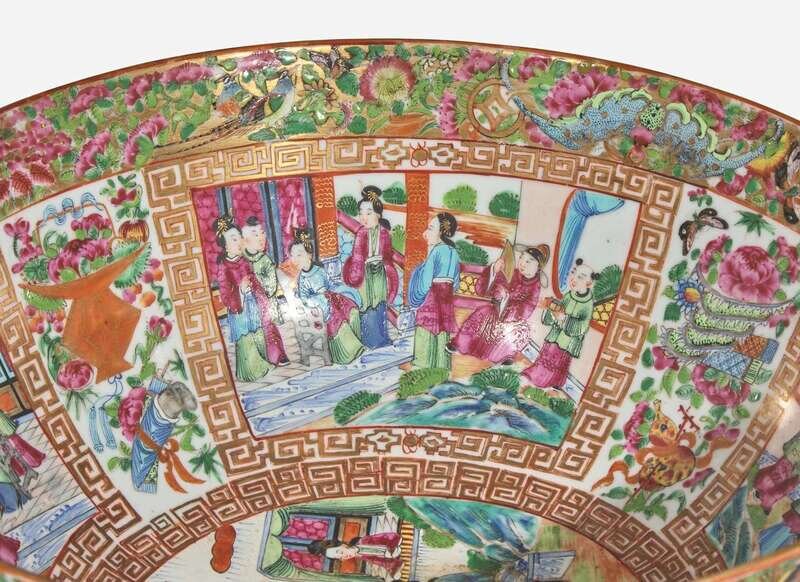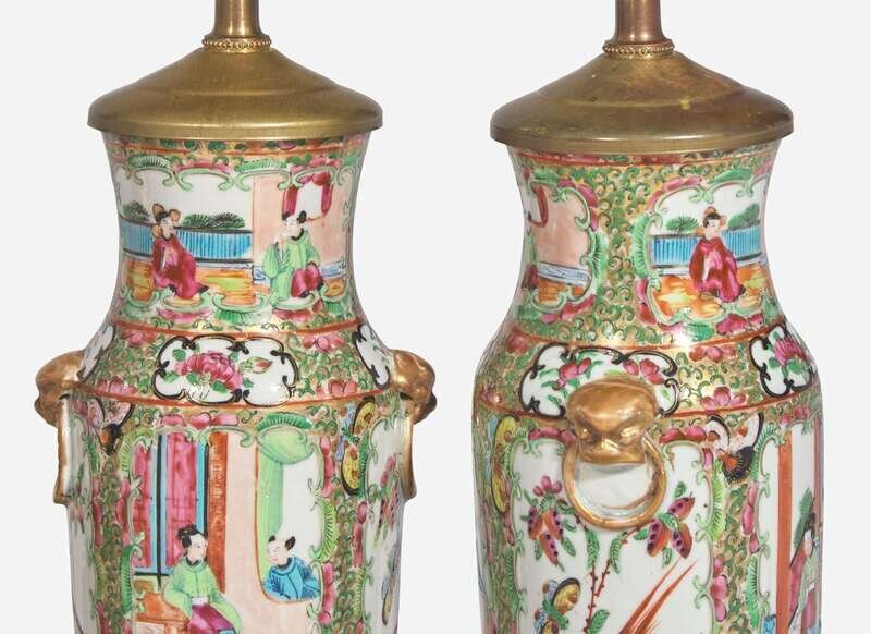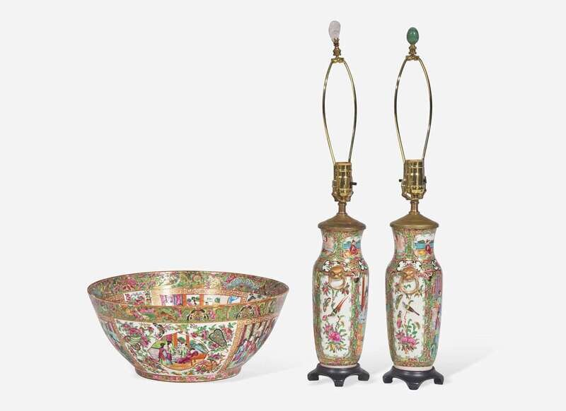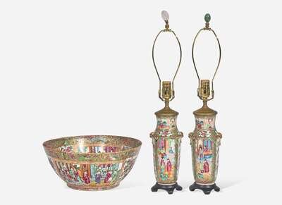 A Chinese Export porcelain Rose Mandarin punch bowl and pair of vases mounted as lamps, 19th century
