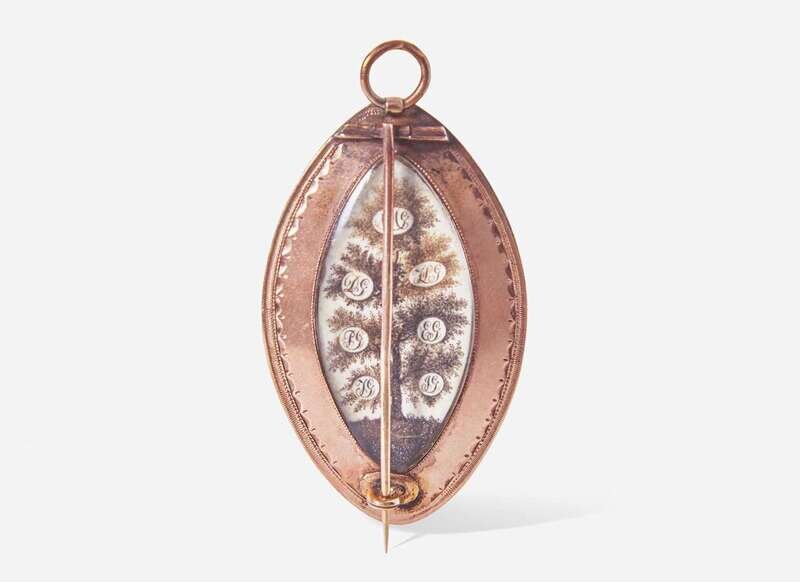 Of navette form, worked en grisaille, the reverse with a hairwork tree of life with initials of seven family members, in an enameled and bright-cut gilt case.